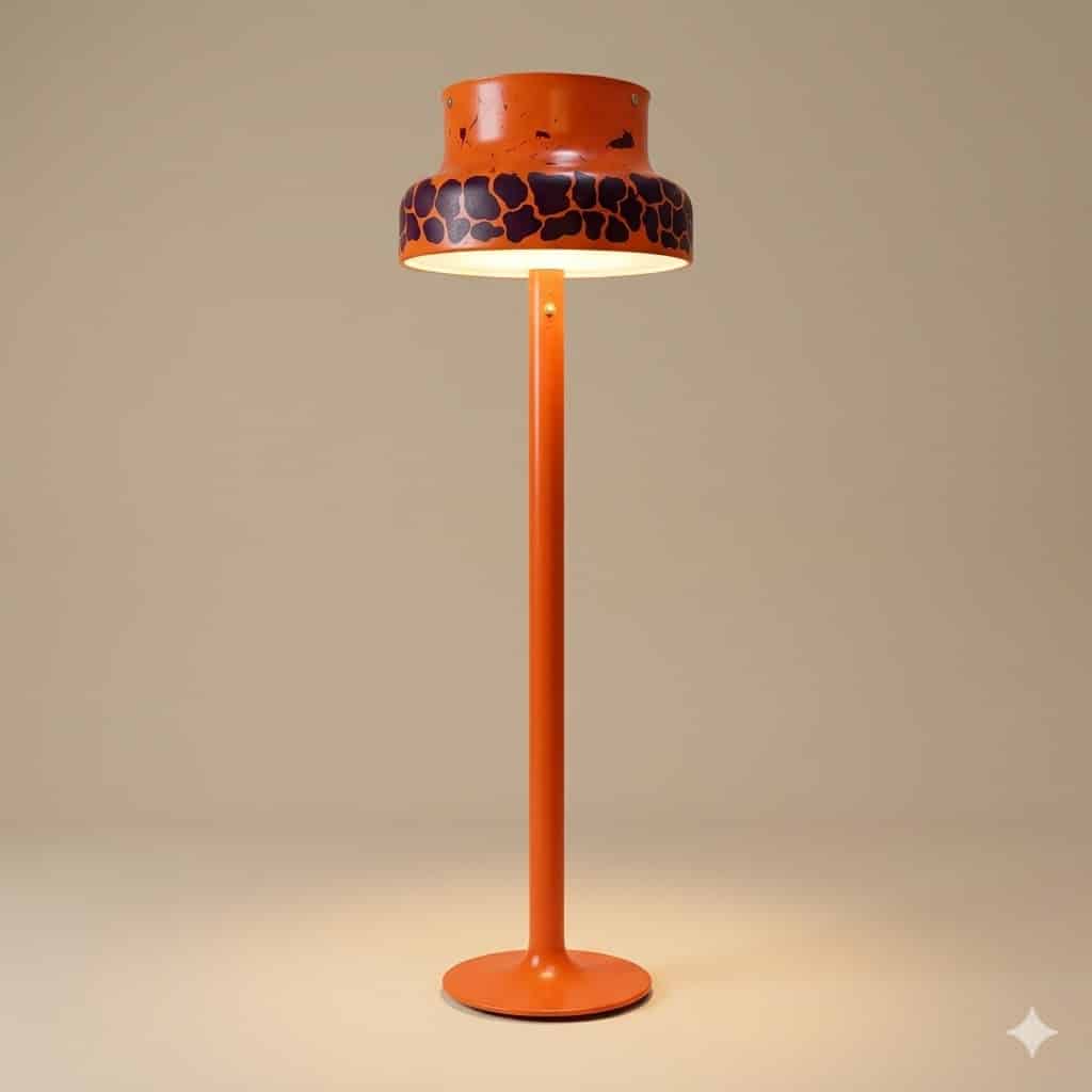 A sculptural floor lamp from Ateljé Lyktan, Åhus, reinterpreted through a bold, hand-painted finish in vivid orange. The iconic double-tiered shade, associated with Anders Pehrson’s celebrated mid-century designs, has been given a new visual identity while preserving its original form and function.