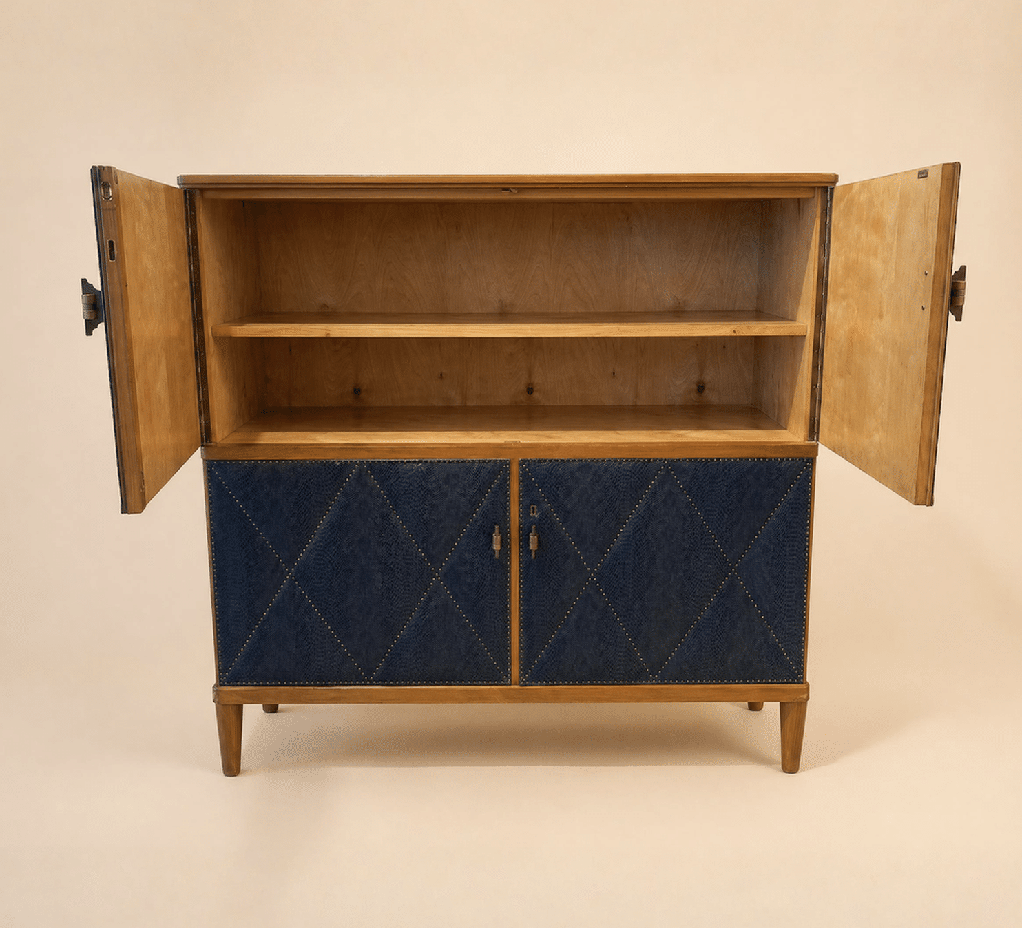 A striking cabinet with a handcrafted front in leather-look material, detailed with decorative studs arranged in a geometric diamond pattern. The surface creates depth and texture, giving the piece a strong visual identity.