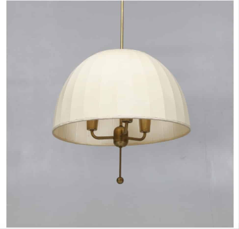 An elegant and refined ceiling pendant by Swedish lighting master Hans-Agne Jakobsson (1919–2009). The wide domed fabric shade in cream, suspended on a polished brass frame with a classic pull-cord, casts a beautifully soft and even light. Timeless Scandinavian sophistication at its finest. Diameter 45 cm. Frame: brass, shade: fabric.