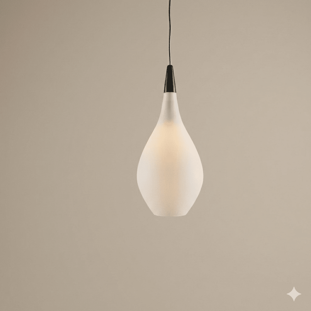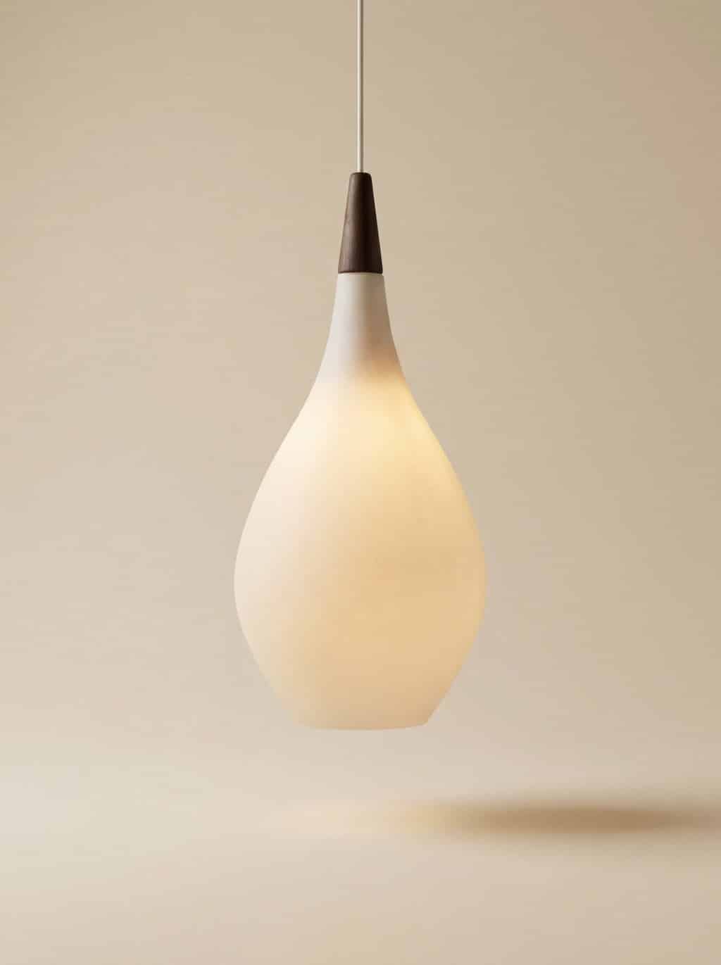 A striking mouth-blown glass pendant from the legendary Danish glassworks Holmegaard. The oversized teardrop form in white glass creates a soft, diffused light with a clean and sculptural presence.
