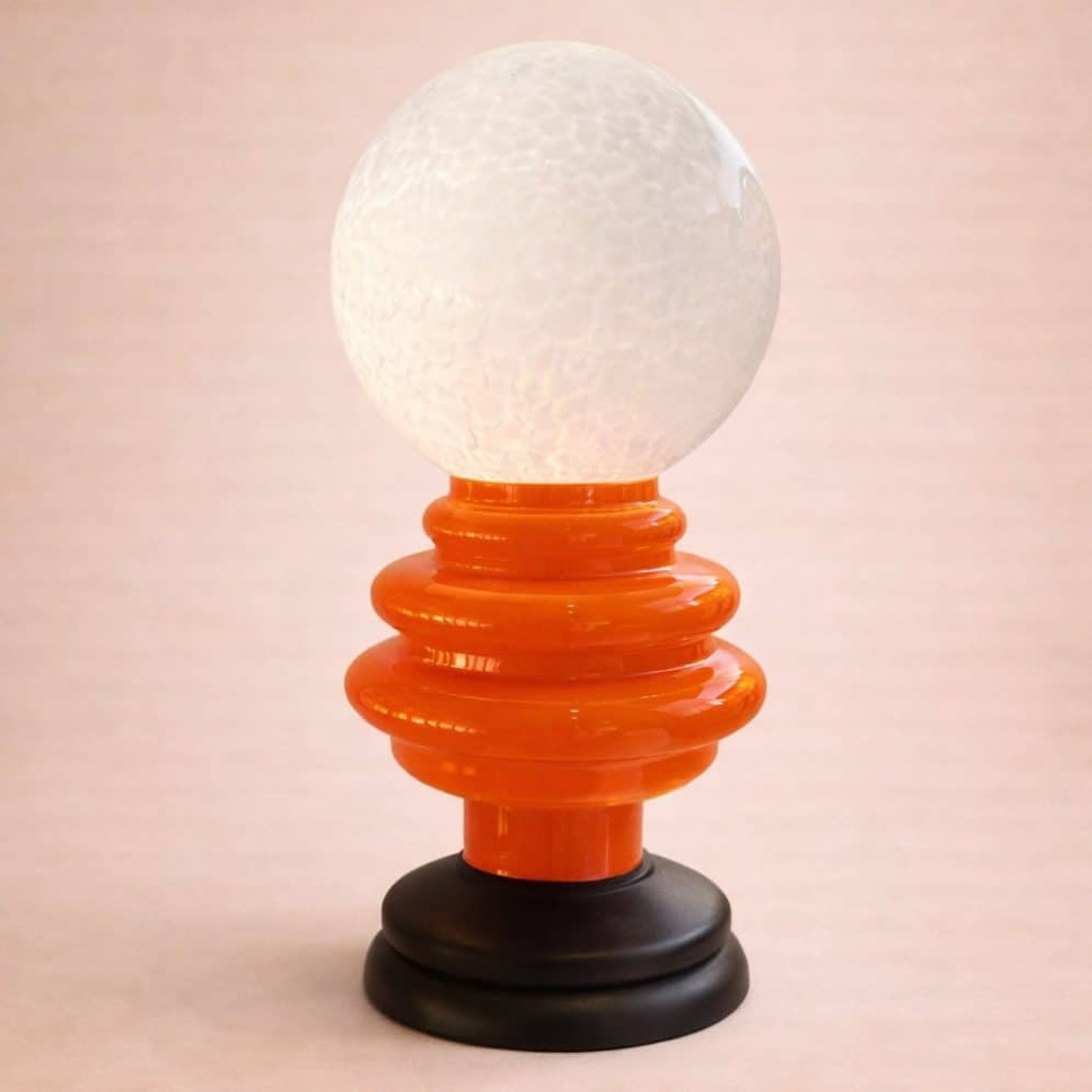 A spectacular and rare Space Age table lamp from Italy, 1970s. The boldly stacked orange ceramic rings rise like a futuristic totem, crowned by a large white mottled glass globe that glows with extraordinary warmth when lit. The contrasting black lacquered wooden base grounds the composition with confidence. This is Italian design at its most exuberant — playful, dramatic, and utterly of its era. A true collector’s statement piece that commands attention in any interior.