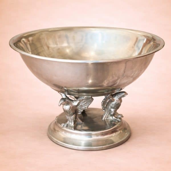 An elegant and distinguished pewter footed bowl from the iconic Swedish design house Svenskt Tenn, renowned for its mastery of pewter craft since the 1920s. The wide, generously proportioned bowl sits on a sculpted stem adorned with three decorative bird or eagle figures — a refined classical motif executed with fine detail and restraint. The cool silver-grey lustre of the pewter is characteristically Scandinavian in its understated sophistication. A collector’s piece and a genuine slice of Swedish design heritage. Ø 30 cm, H 20 cm.
