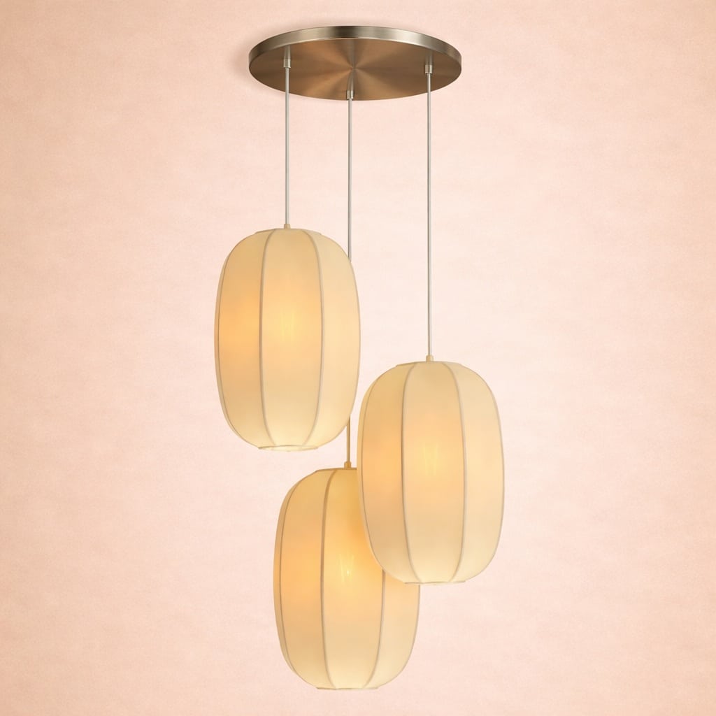 An elegant and softly atmospheric triple pendant lamp in the Scandinavian modern tradition. Three generously sized oval shades in cream-white fabric hang at staggered heights from a brushed steel ceiling canopy, casting a warm, diffused glow. The simple, clean lines and quality fabric shades make this a versatile and timeless choice for a dining room, kitchen, or living space. A quietly beautiful piece that works in both classic and contemporary interiors.