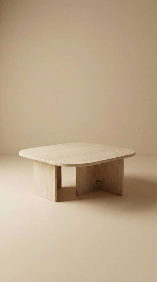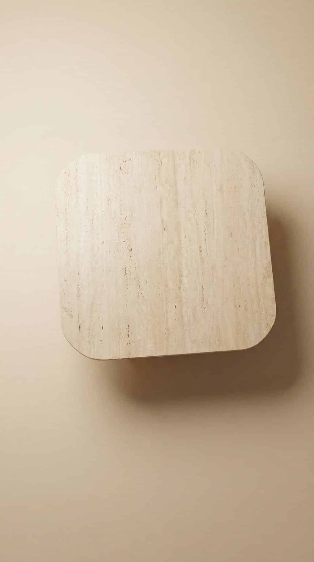 A beautifully understated square coffee table with a thick top in light natural stone, its open porous surface revealing the raw, organic texture of the material. The quiet, mineral beauty of this piece makes it a versatile companion to both classic and contemporary sofas. A piece that improves with age and brings natural warmth to any living space.