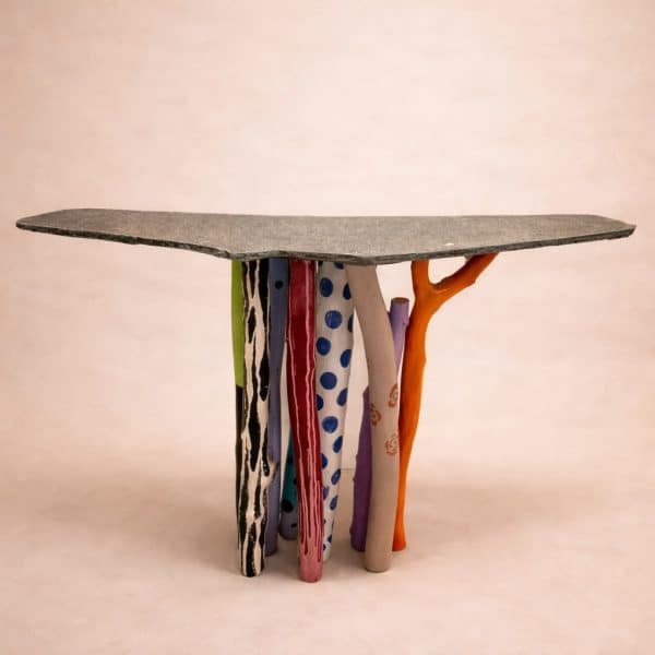 A one-of-a-kind console table that is as much art installation as furniture. The raw natural stone top rests on an eclectic collection of hand-painted wooden legs — each one unique in colour and form, from zebra-striped to polka-dotted to organic branch-like shapes. Playful, bold and utterly original, this piece transforms any hallway or living space into a gallery.