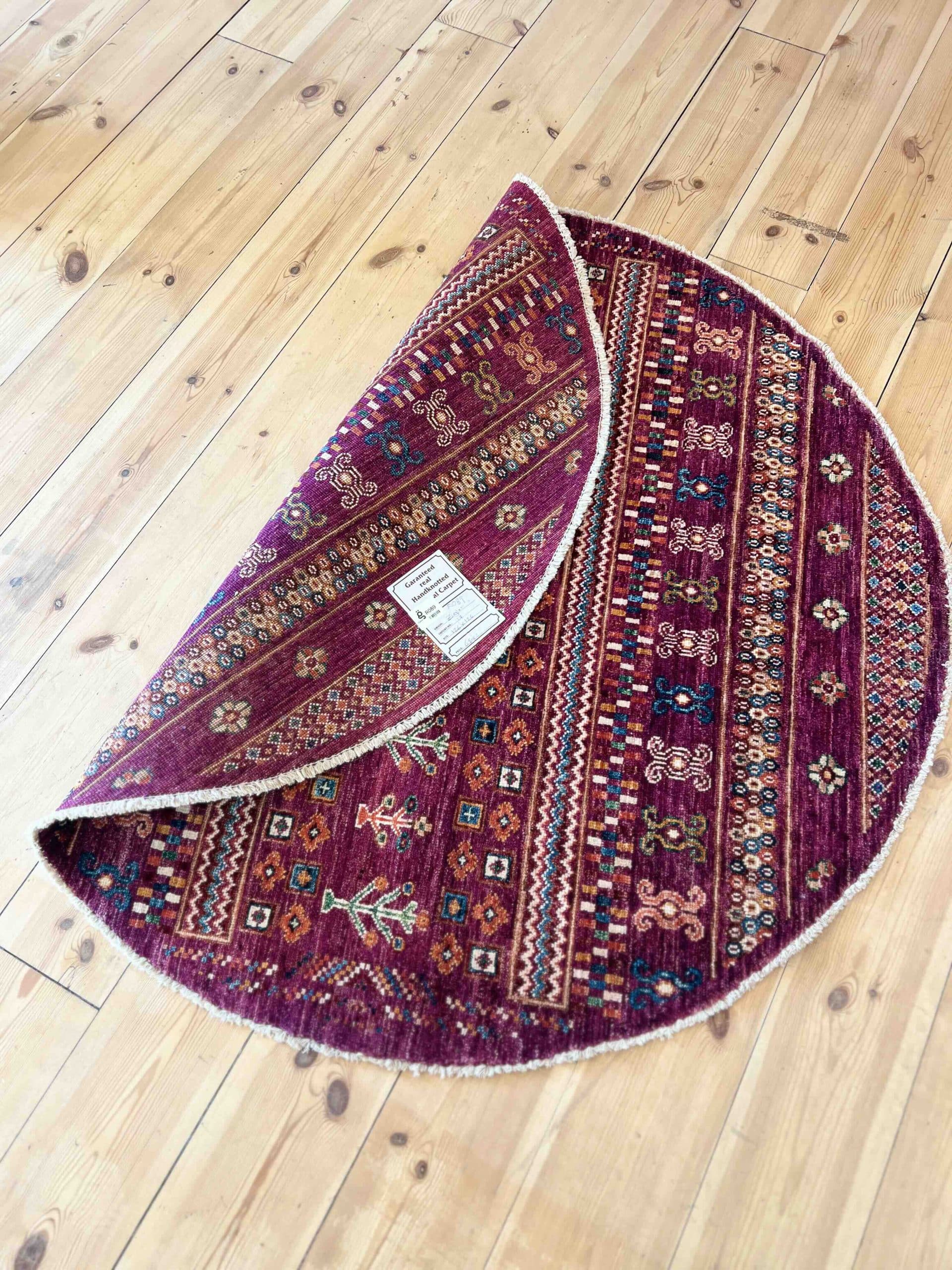 A striking round handknotted Ziegler rug in a deep, jewel-like magenta and burgundy ground, richly decorated with horizontal bands of intricate floral and geometric motifs in teal, orange, gold and green. The Ziegler weaving tradition produces carpets of exceptional density and colour depth — and this bold, saturated piece is no exception. A rare and eye-catching format for any interior. Diameter approx. 100 cm.